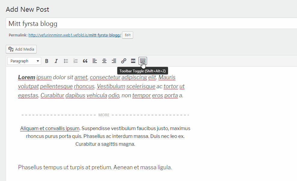 Ef þú smellir á „toolbar toggle“ hnappinn færðu fleiri valmöguleika. Til dæmis geturðu þá breytt litnum á textanum, dregið málsgreinar inn, sett inn sjaldgæf tákn o.fl. Smelltu á spurningamerkið til að sjá helstu flýtihnappa.